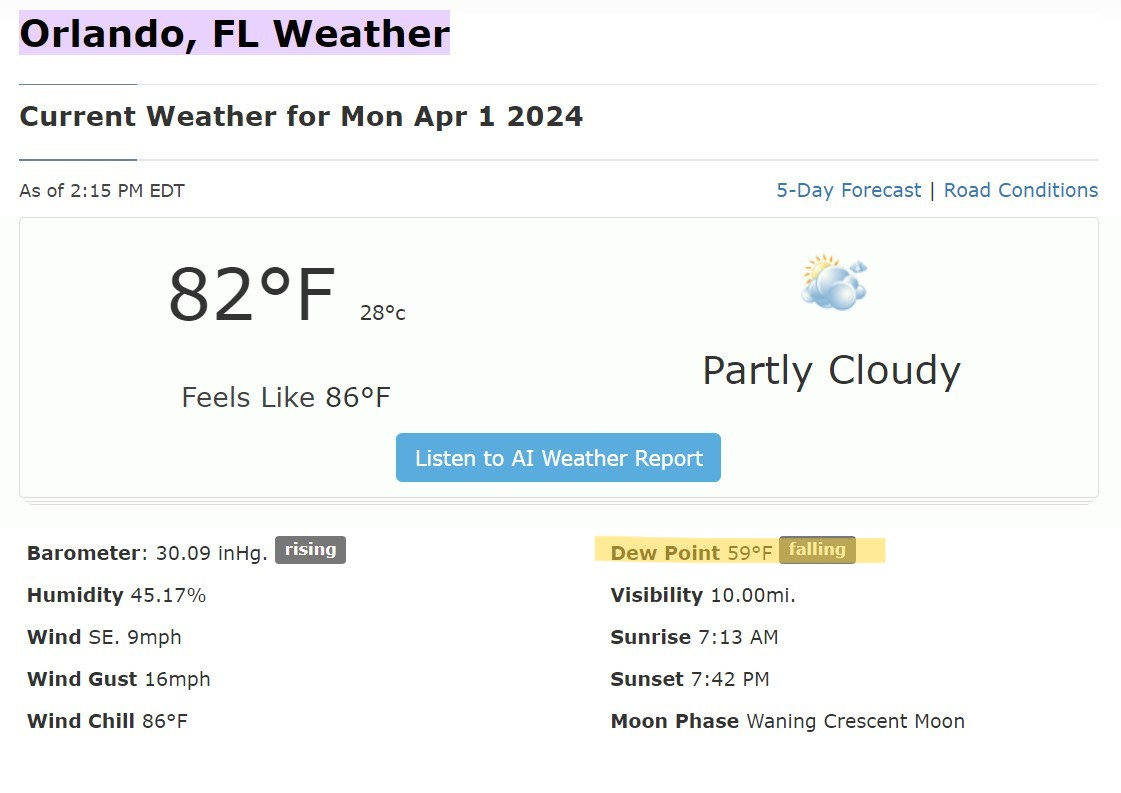 It turns out, however, that many scientists are not fans of relative humidity as a moisture indicator because it can be inaccurate, misleading, and confusing to compare what is to what potentially could be (and that’s if the temperature doesn’t change the percentage!). According to these scientists, a better calculation for humidity is the dew point.
