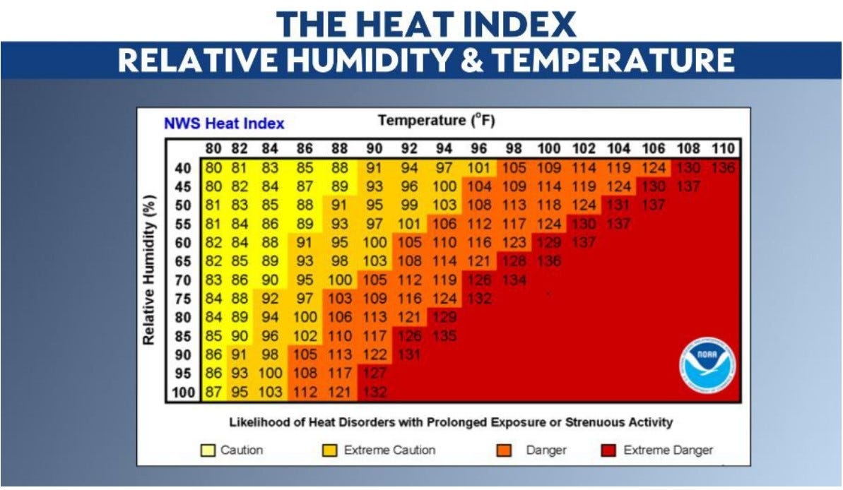 *It’s important to note that the heat index is only for shady locations. Direct sunlight exposure can increase the “feels like” temperature by up to 15 degrees.